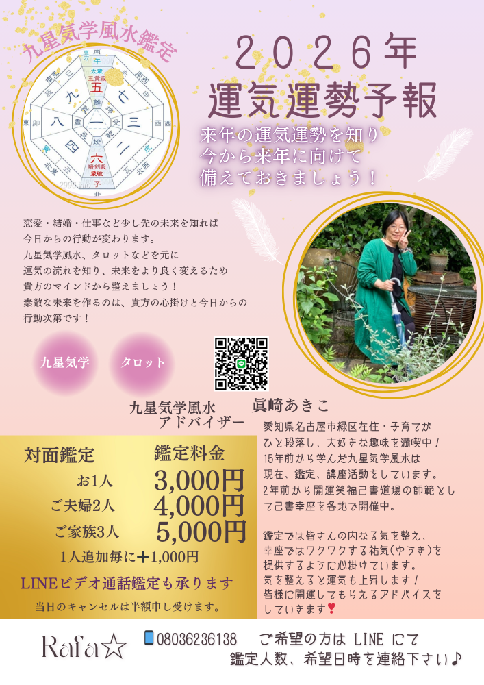 Rafa☆ 九星気学風水鑑定 | 対面での鑑定 約90分〜120分 *内容やお時間により価格は変わります *ご希望の方にはLINEビデオでの通話鑑定もあります |